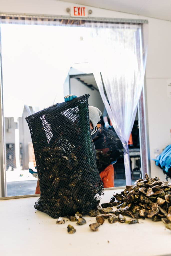 The bags are carefully jostled every so often to ensure the oysters grow evenly and do not become attached to one another. When the different types of oysters, and the clams and mussels have reached maturity and market size the crews begin “harvesting”.